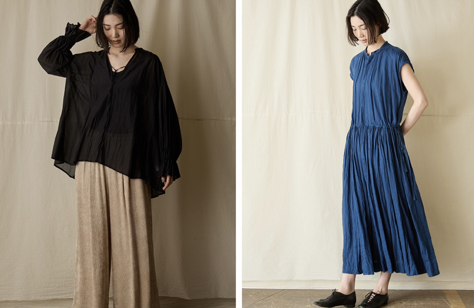 コレクション全体には、どこか詩的で空気を含んだような雰囲気があり、ナチュラル、アルチザン、モードといった要素を横断しながらも、単純にそのどれかに分類しきれない独自性があります。シャツやブラウスは軽やかな生地感と美しいドレープで見せ、ワンピースやコートは分量感がありながら決して重たく見えず、着ることで完成する立体感が魅力です。